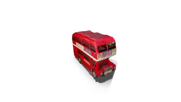 A model of a bus, representing public transportation commonly used in urban and rural areas. It is the classic London bus, bright red and double-decker.