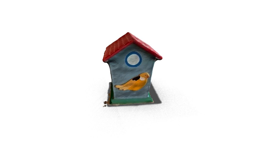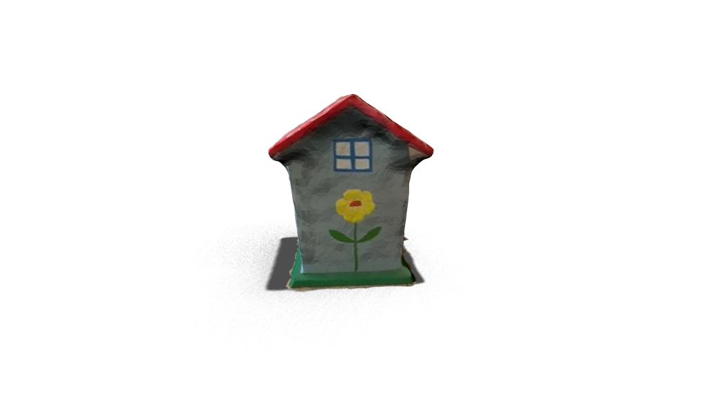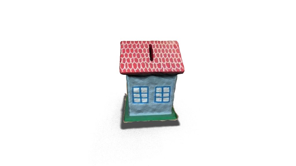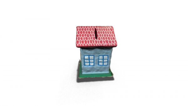 A 3D model of a piggy bank or moneybox in the shape of a house, used for saving money