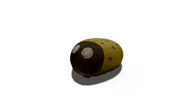 A painted stone resembling a black and yellow ladybug, designed to engage children with nature-inspired art
